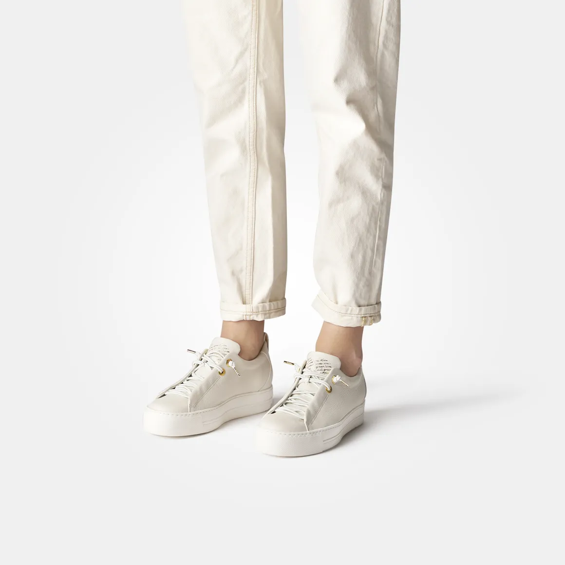 Refined and refreshingly new Paul Green presents you this light beige sneaker! The exclusive calf leather is complemented in this model by an effective rubber lacing, through which you can slip in an instant. The extra-light platform sole is flexible and gently cushions your steps. Due to the specially designed heel cap made of butter-soft leather, you can look forward to pleasant comfort!