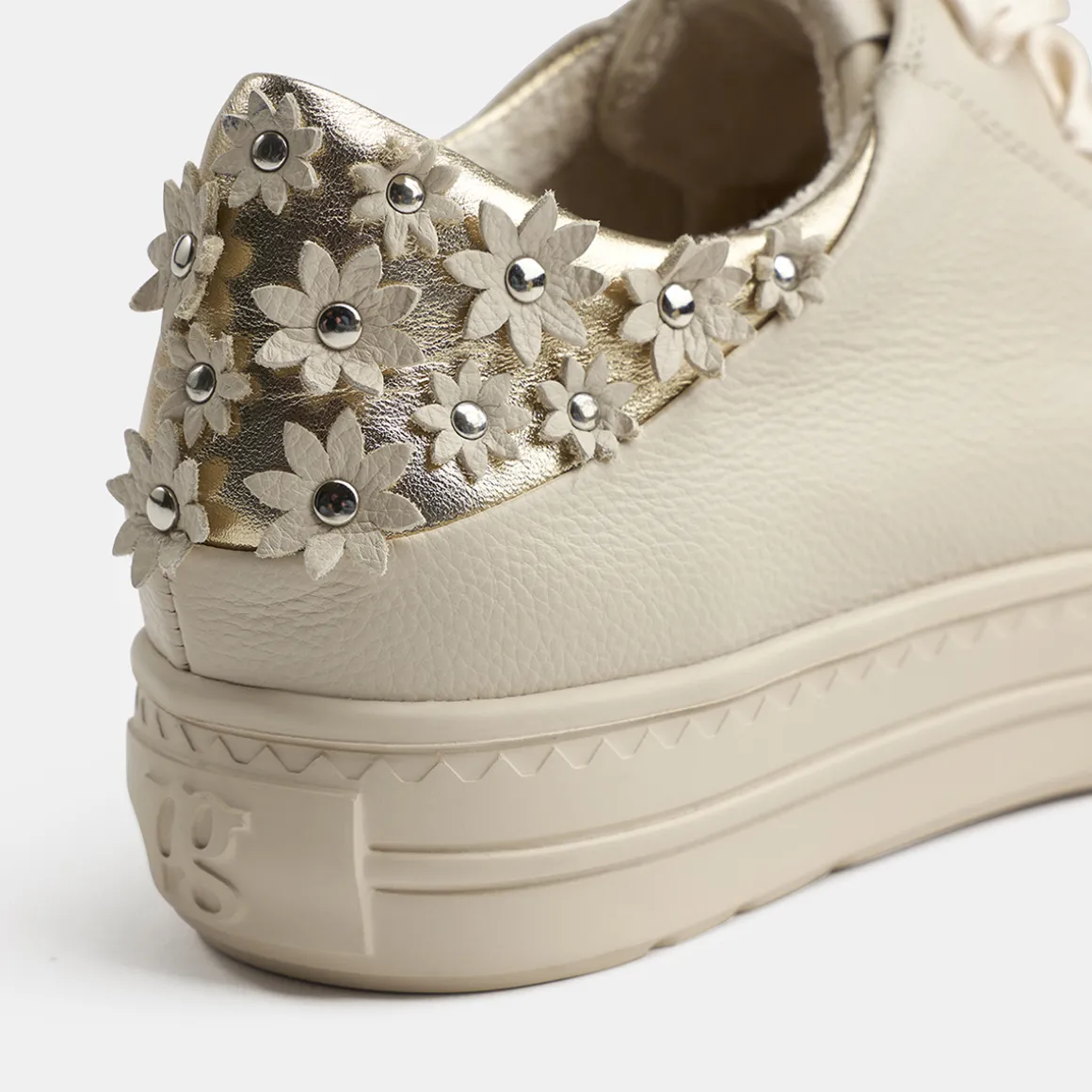 With pretty style and a romantic touch, these SUPER SOFT Pauls from Paul Green present themselves. The playful sneakers made of beige smooth leather with detailed flowers on the heel bring charming flair to your wardrobe. With the matching satin ribbon an absolute eye-catcher. A super soft leather terry lining optimizes superb comfort. Discover this pair for hip looks! Each Paul Green shoe is handmade in up to 160 steps and then inspected. This ensures that it meets the high standards of fit and quality.