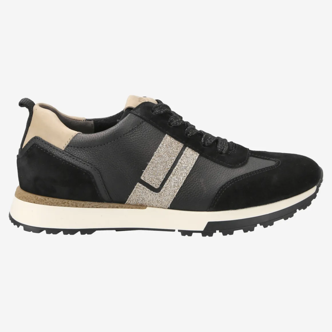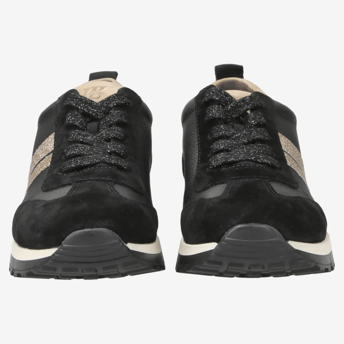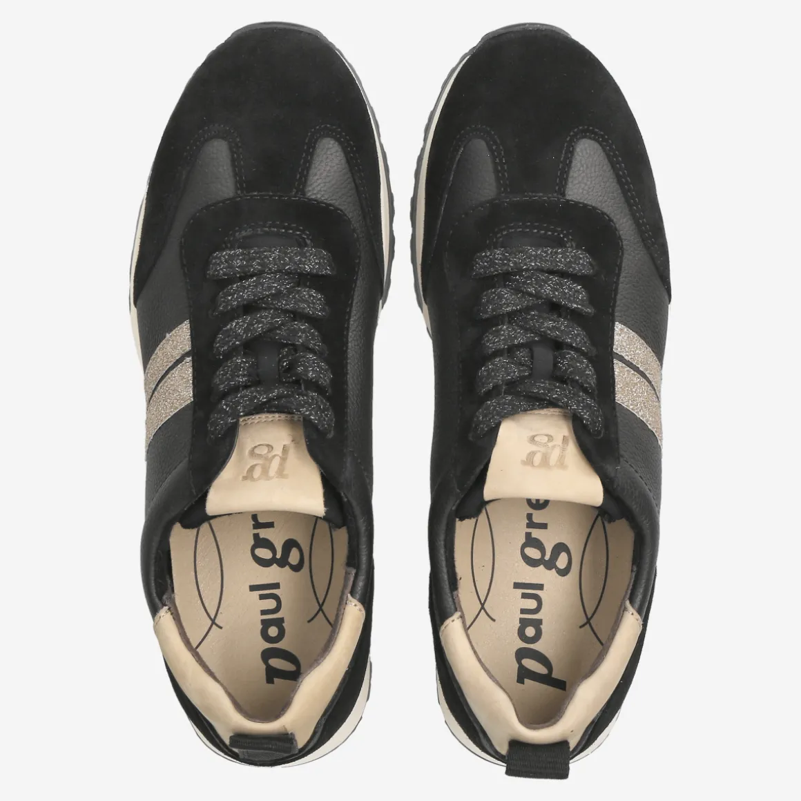 - removable footbed, suitable for inlays, entry loop, embossed logo, logo application, details in gold glitter look, stylish black laces with silver glitter, decorative stitching
