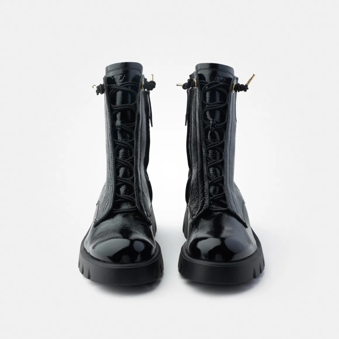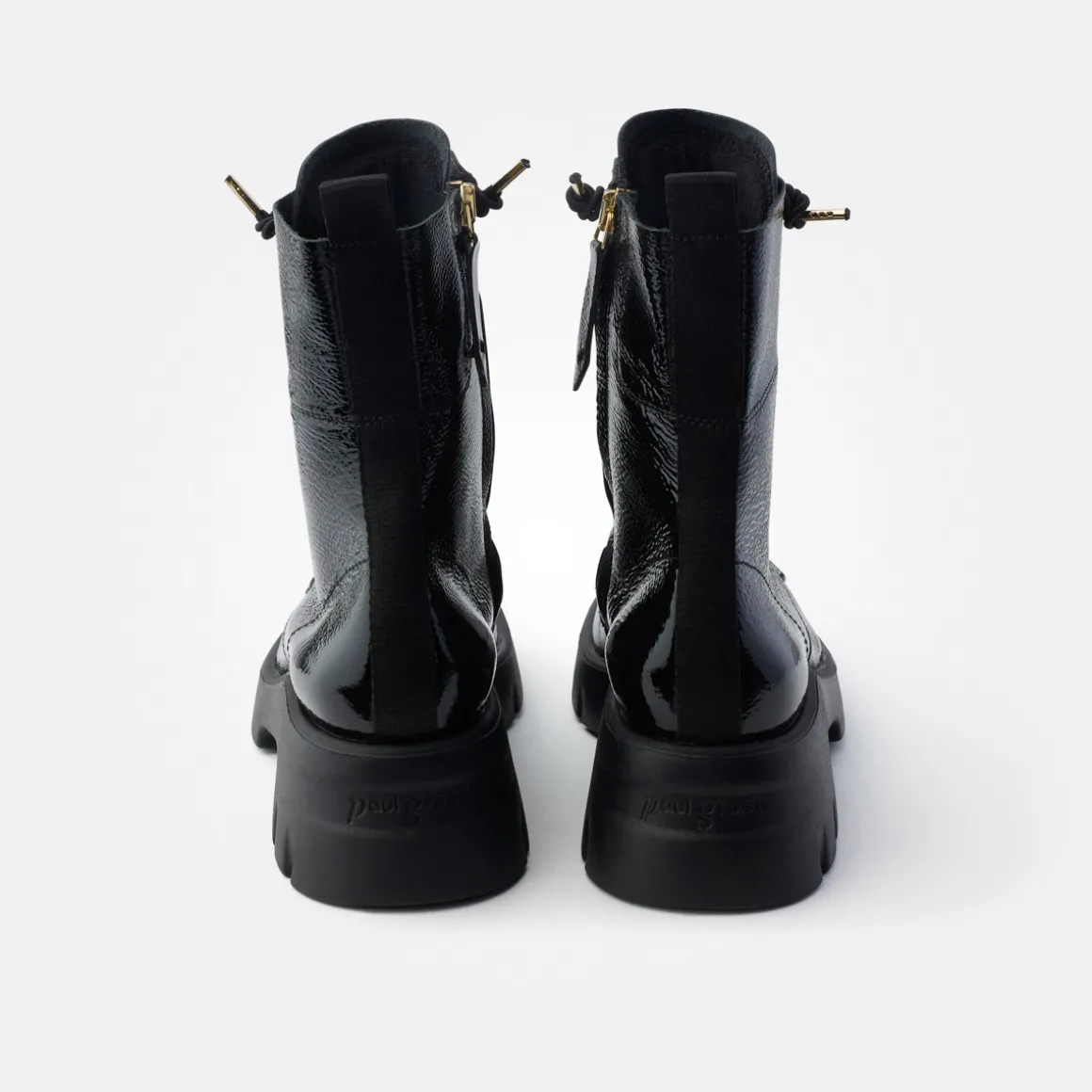 - Made in Europe, PFI Eco-Label LWG – Leather Working Group certified, block heel, platform sole, entry loop, embossed logo, zipper, double elastic lacing and gold-coloured metal details, breathable