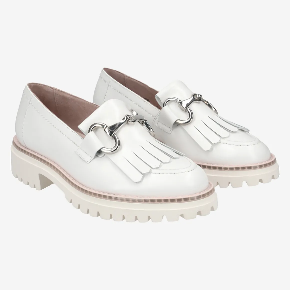 Fashionistas love these SUPER SOFT loafers from Paul Green because they are hip and go with everything. The white smooth leather with fringe part and noble chain at the instep area creates a modern fashion style. Puristic noble look shows the loafer with flexible outsole and transparent frame. The ideal partner for any look! Paul Green makes shoes with great passion and mastery, which is expressed in perfection, quality, style and fit. The result: a unique, uplifting wearing experience! The Paul Green effect.