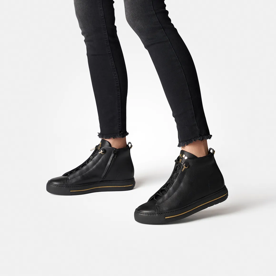 These fashionable SUPER SOFT hightop pairs are unrestrictedly comfortable and therefore perfect for leisure time. The model inspires with soft smooth leather in black. The elastic laces complete a relaxed feel. A concealed zipper on the inside optimizes quick on and off. The soft leather lining with TENCELâ„¢ fibers delights with excellent coziness. Prove individuality with these sneakers! Paul Green makes shoes with great passion and mastery, which is expressed in perfection, quality, style and fit. The result: a unique, uplifting wearing experience! The Paul Green effect.