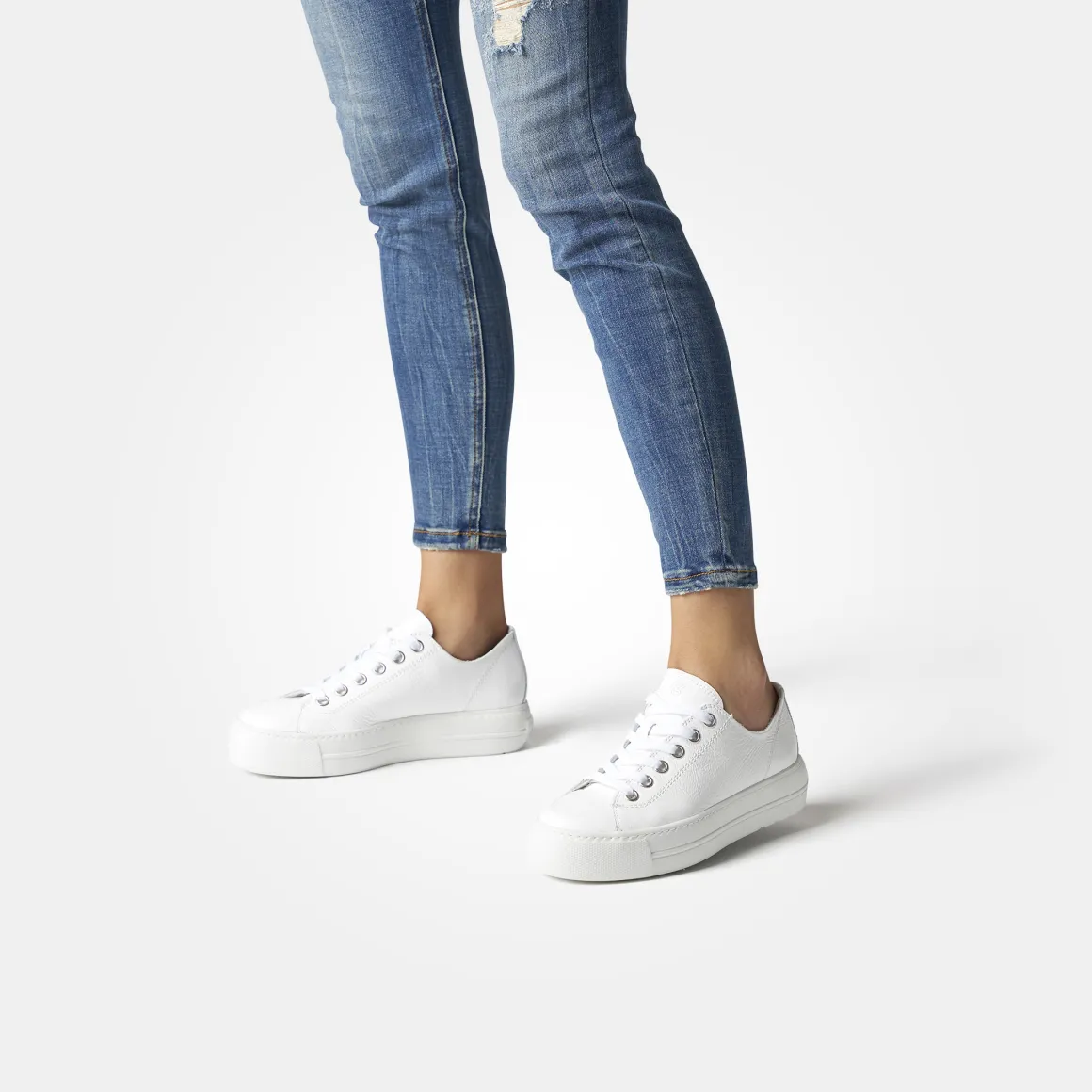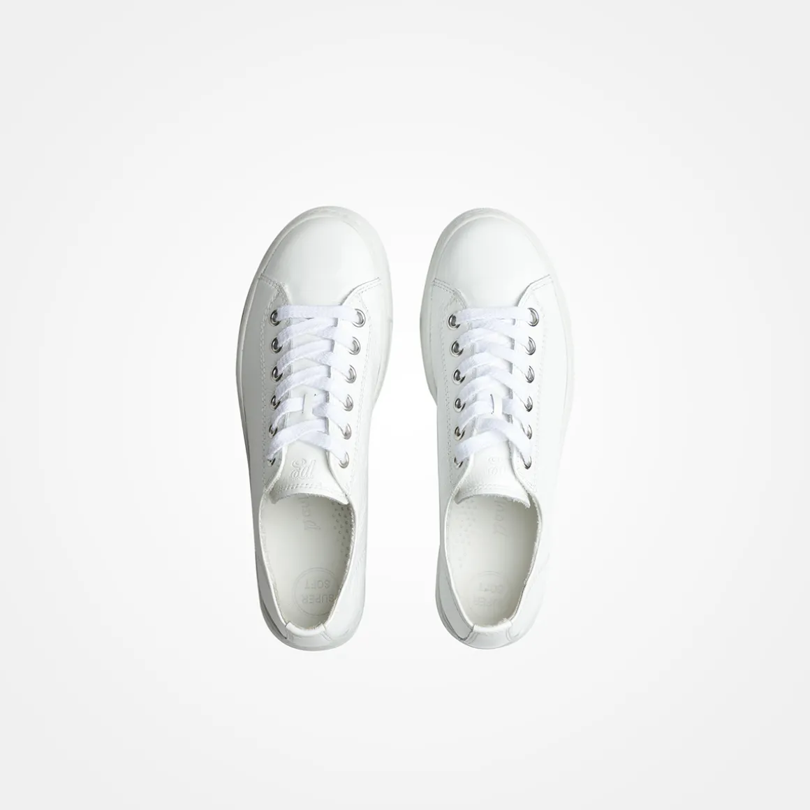 With the new platform models from Paul Green, you can really talk about a radiant appearance for once. The soft crumpled patent leather and the terry laces in combination with the PG Soft technology make the model an absolute comfort experience, both visually and haptically. The discreet decorative stitching further refines the image. Thanks to the pure white appearance, both the impressive sole and the striking leather immediately get a lot of attention and create a fantastic overall image