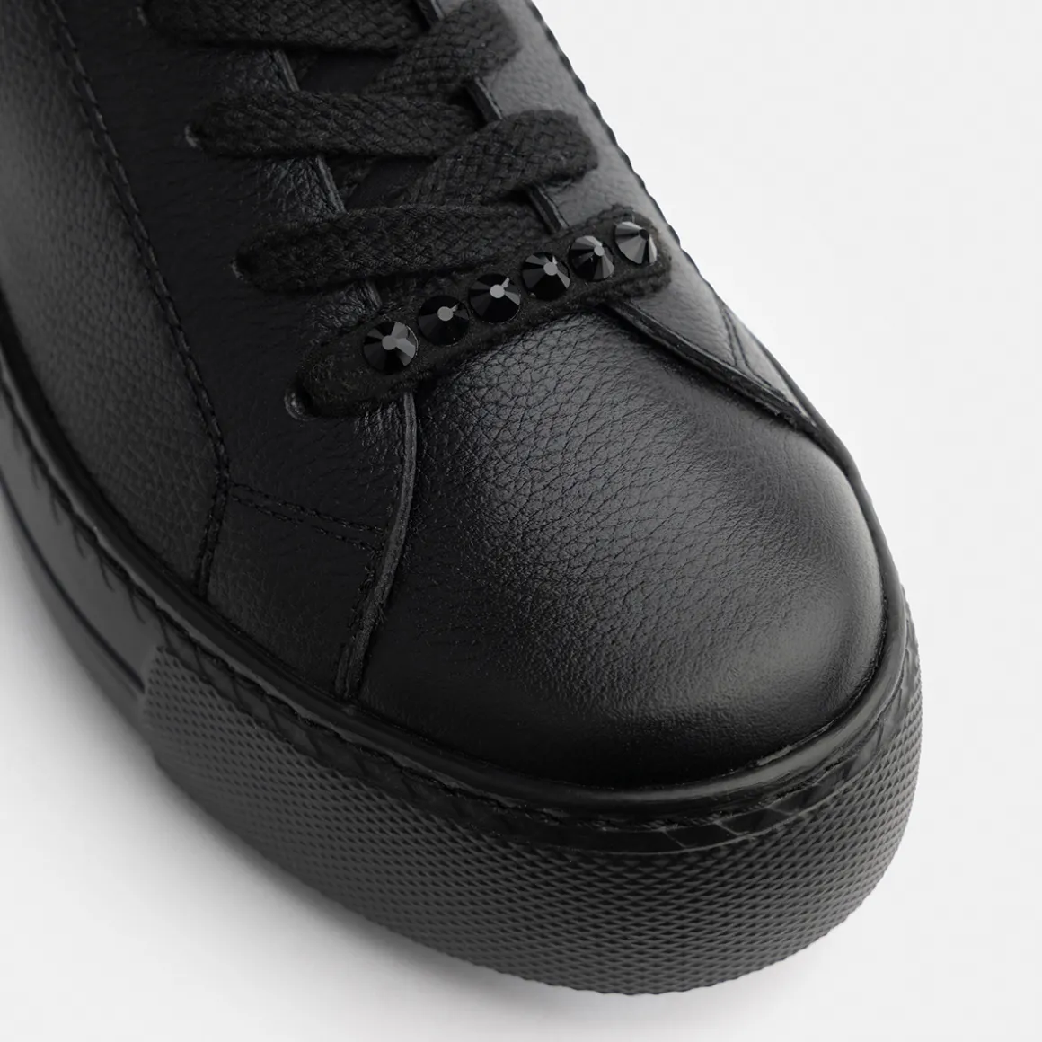 - SuperSoft, supple leather, soft heel cap, lightweight and flexible outsole, soft footbed, platform sole, silver glittering logo print on the tongue, lace-up element with six glittering stones, top eyelets with all-round micro-glittering stones, embossed logo on the rubber sole, decorative stitching, breathable, platform sole