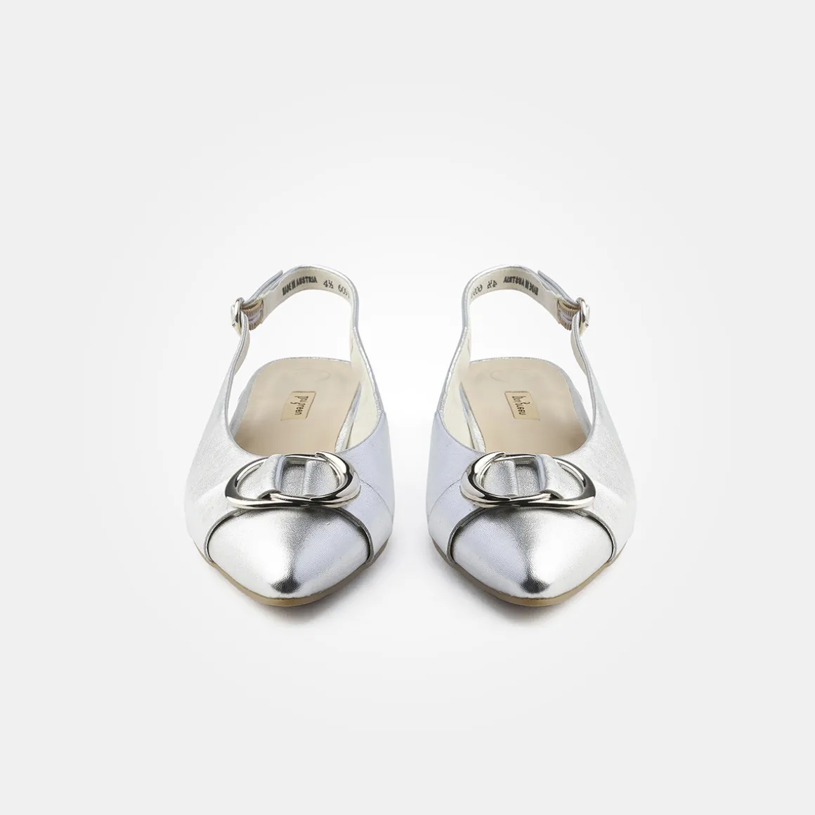 - SuperSoft, supple leather, soft heel cap, lightweight and flexible outsole, soft footbed, stretch insert, decorative buckle in the design of a loafer application, sling pump