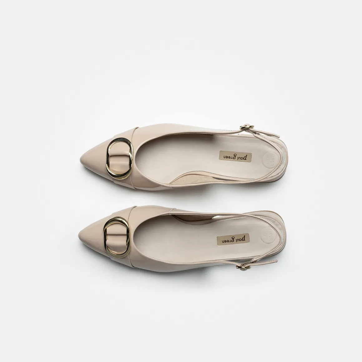 - Metal fastening, stretch insert, decorative appliqué, breathable, sling pumps, elegant and in the “quiet luxury trend”