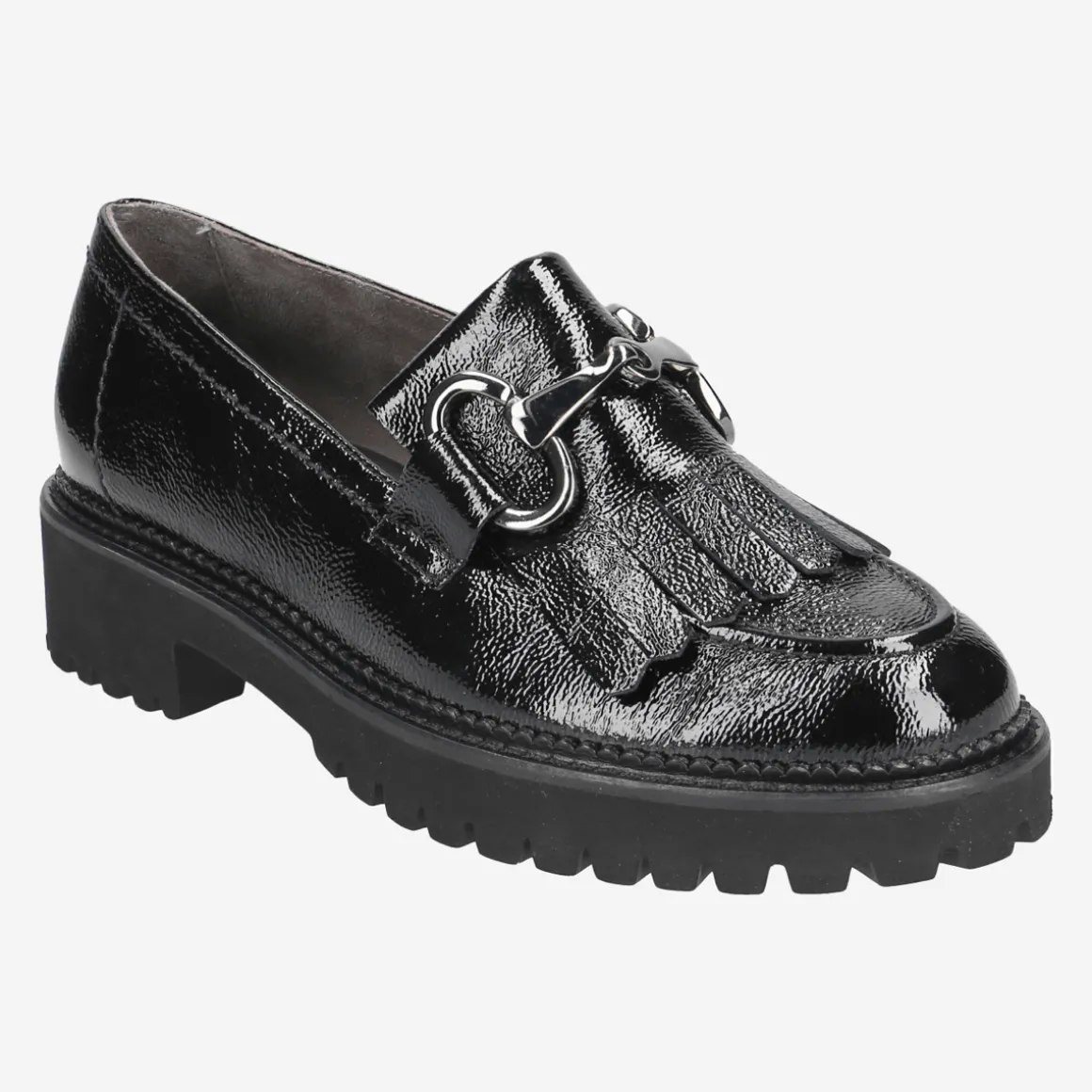 These SUPER SOFTEN loafers from Paul Green present themselves in an expressive design. The beautiful crumpled patent leather in black is contrasted by a noble chain and fringes and thus follows the trend of the season. Due to the super soft processing, the model is extremely comfortable to wear and uncomplicated in handling. The distinctive tread sole underlines the trendy look and ensures a secure appearance. This loafer is a real favorite! Paul Green makes shoes with great passion and mastery, which is expressed in perfection, quality, style and fit. The result: a unique, uplifting wearing experience! The Paul Green effect.