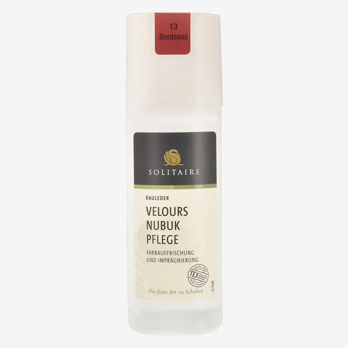 Velour and nubuck care from Solitaire in the color Bordeaux. Impregnates and has a color activating effect. Ideal care for suede and nubuck leather as well as textiles and tex-materials. Contents: 75 ml. Directions for use: Shake bottle well before use. Dab the liquid onto the shoe. Then allow to dry and then roughen with a suede leather brush.