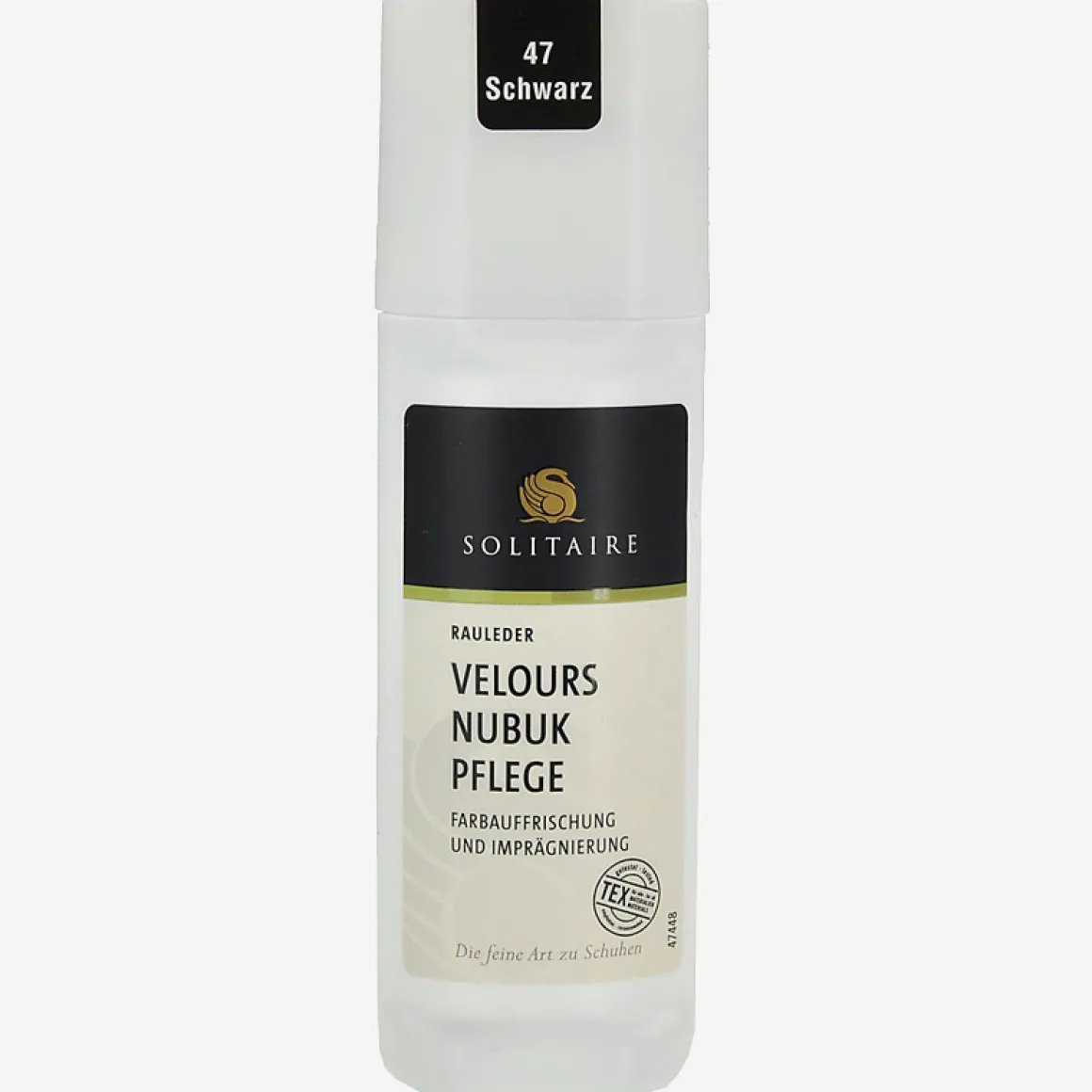 Suede/nubuck care for black suede from Solitaire. Impregnates and has a color activating effect. Ideal care for suede and nubuck leather as well as textiles and tex-materials. Contents: 75 ml. Directions for use: Shake bottle well before use. Dab the liquid onto the shoe. Then allow to dry and then roughen with a suede leather brush.