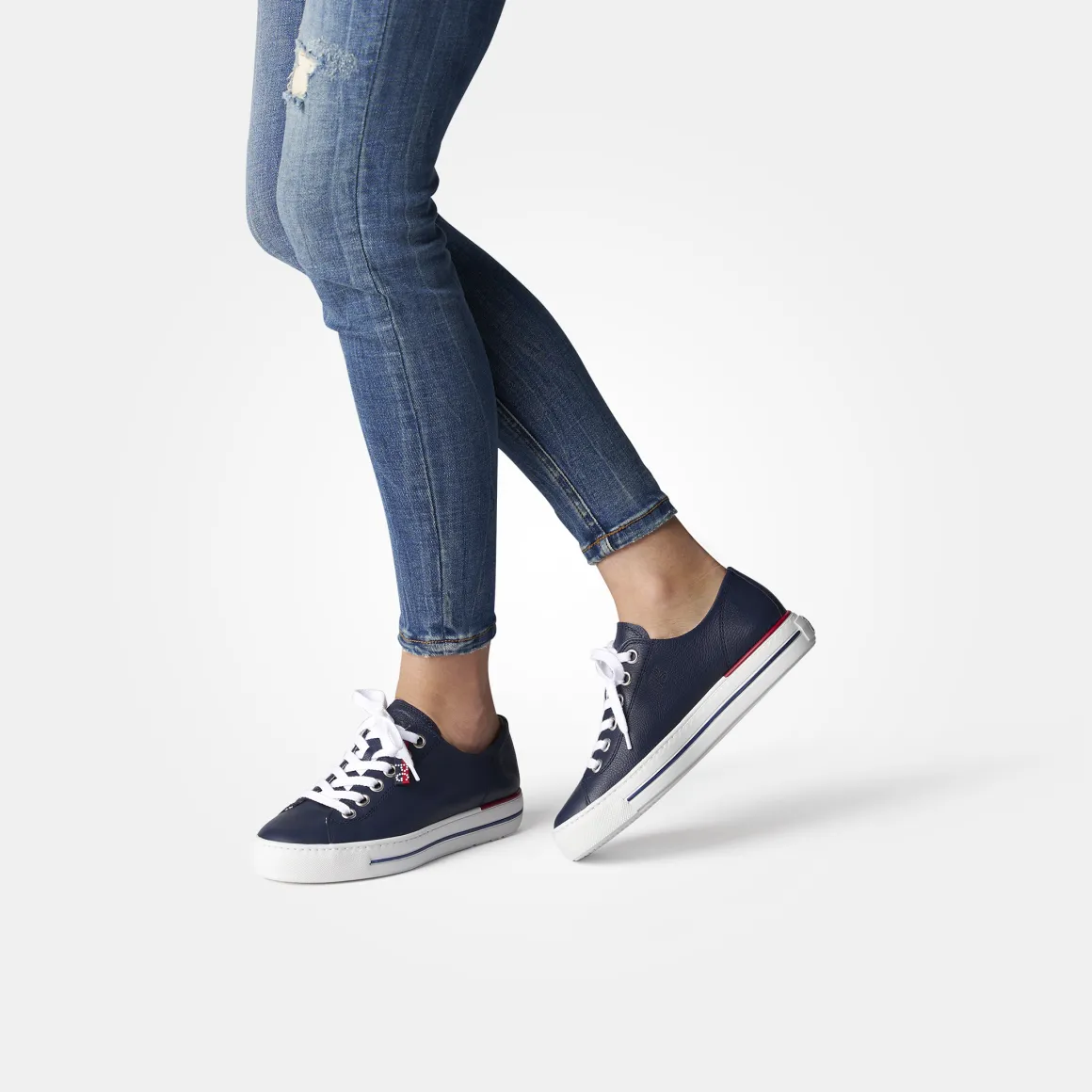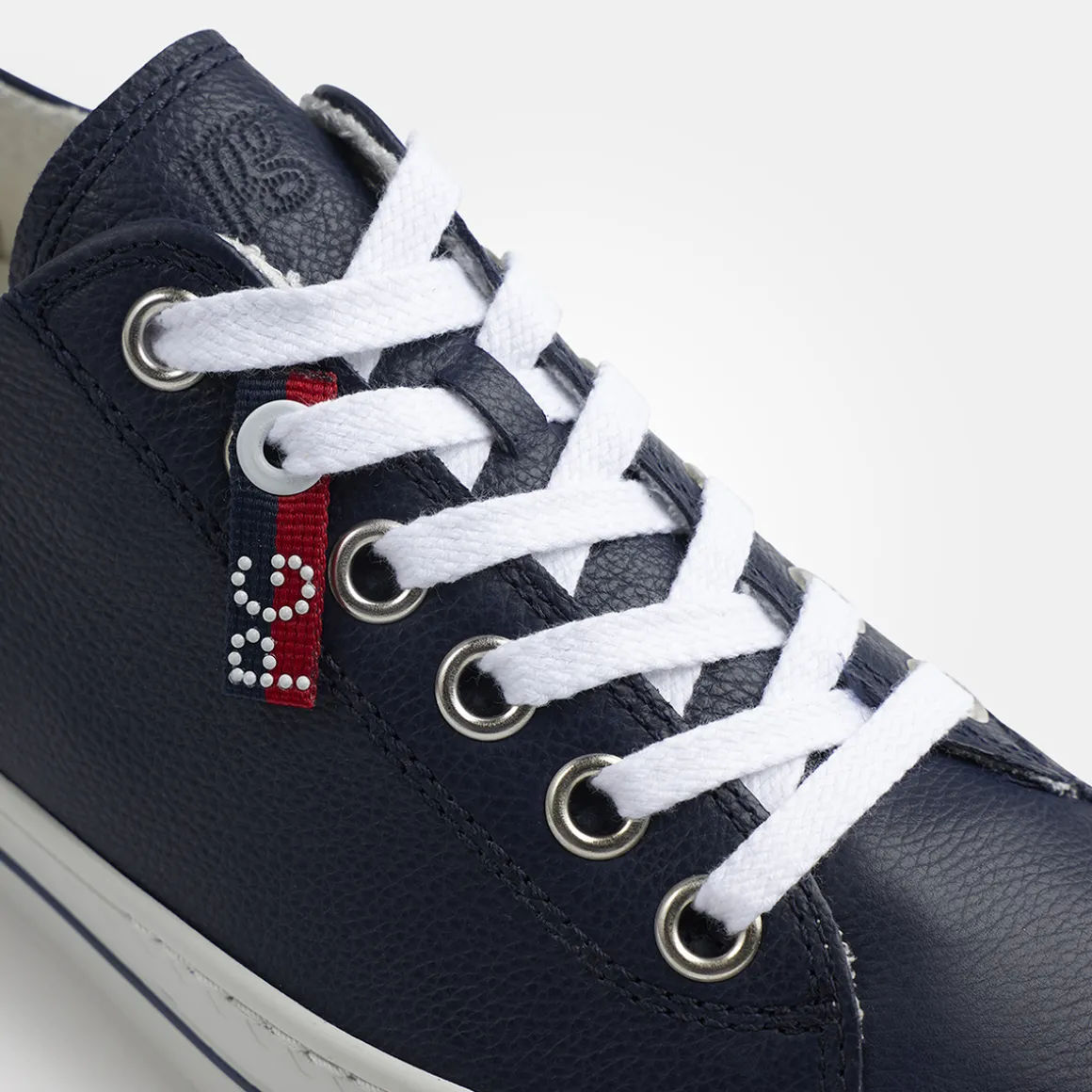 These first-class SUPER SOFT Pauls from Paul Green are an excellent addition to your shoe collection and the epitome of casualness. The model boasts a clean look made from extremely soft, smooth blue leather. The attractive outsole in a trendy striped design also adds a stylish accent. The red and blue grosgrain ribbon on the laces gives the model an eye-catching accent. A super soft heel section hugs the foot comfortably and the soft leather lining with TENCEL™ fibers ensures a pleasant feel. Walk comfortably throughout the day. Definitely the perfect sneaker for your fashionable street styles!