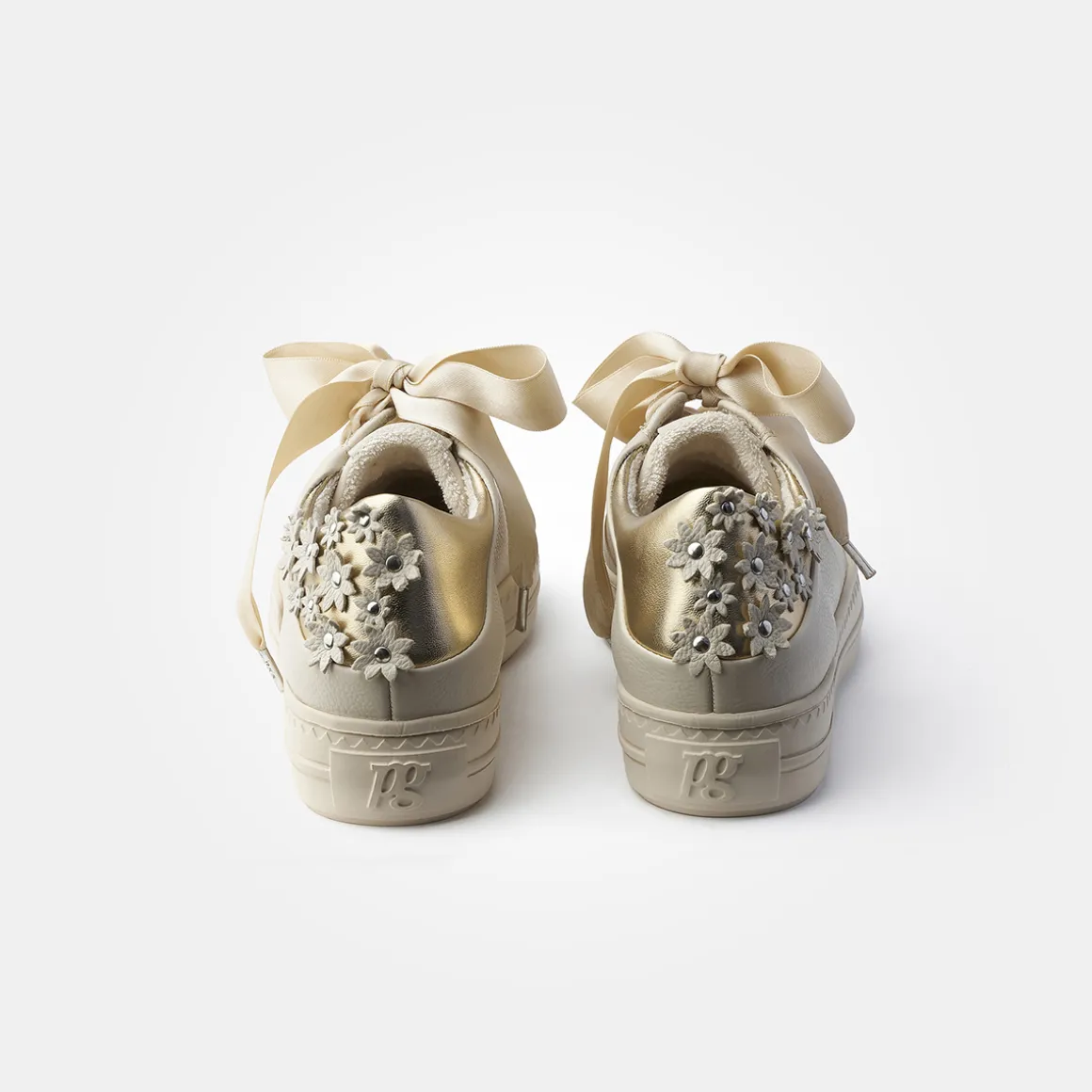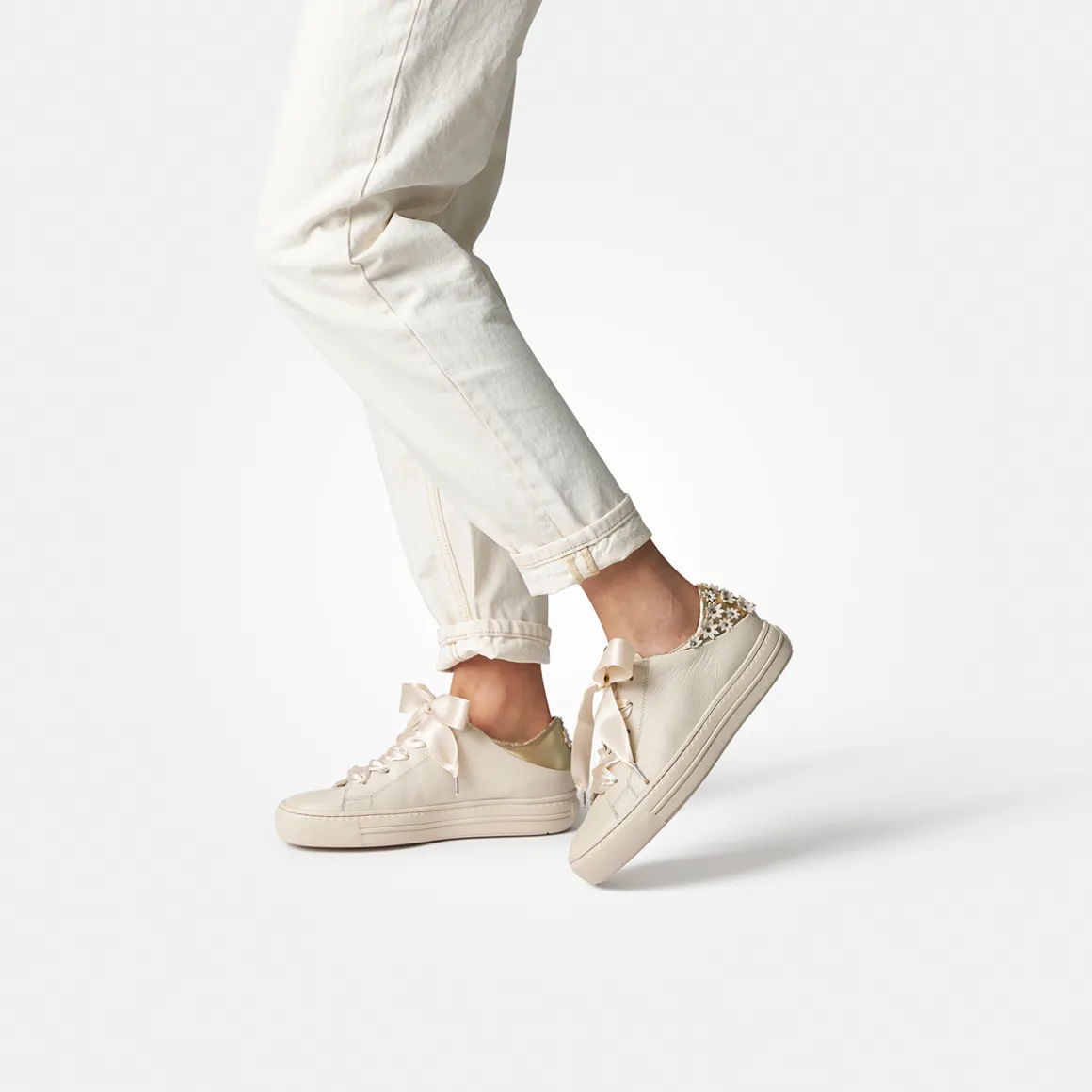 With pretty style and a romantic touch, these SUPER SOFT Pauls from Paul Green present themselves. The playful sneakers made of beige smooth leather with detailed flowers on the heel bring charming flair to your wardrobe. With the matching satin ribbon an absolute eye-catcher. A super soft leather terry lining optimizes superb comfort. Discover this pair for hip looks! Each Paul Green shoe is handmade in up to 160 steps and then inspected. This ensures that it meets the high standards of fit and quality.