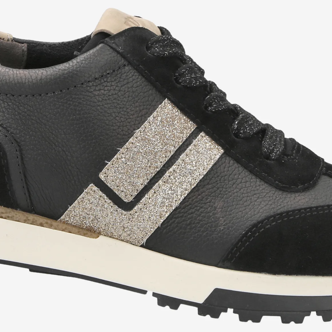 - removable footbed, suitable for inlays, entry loop, embossed logo, logo application, details in gold glitter look, stylish black laces with silver glitter, decorative stitching