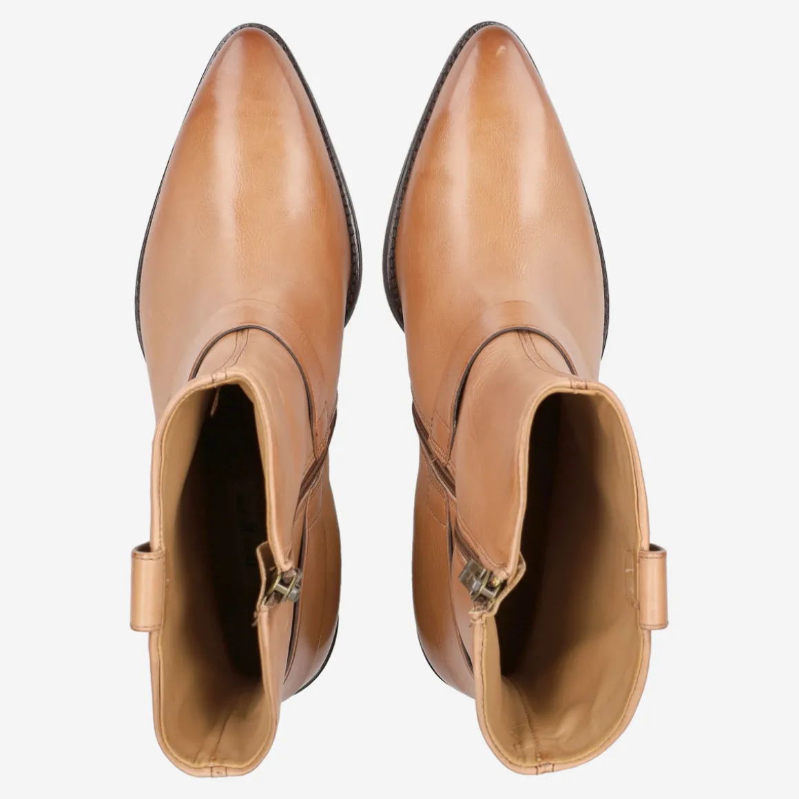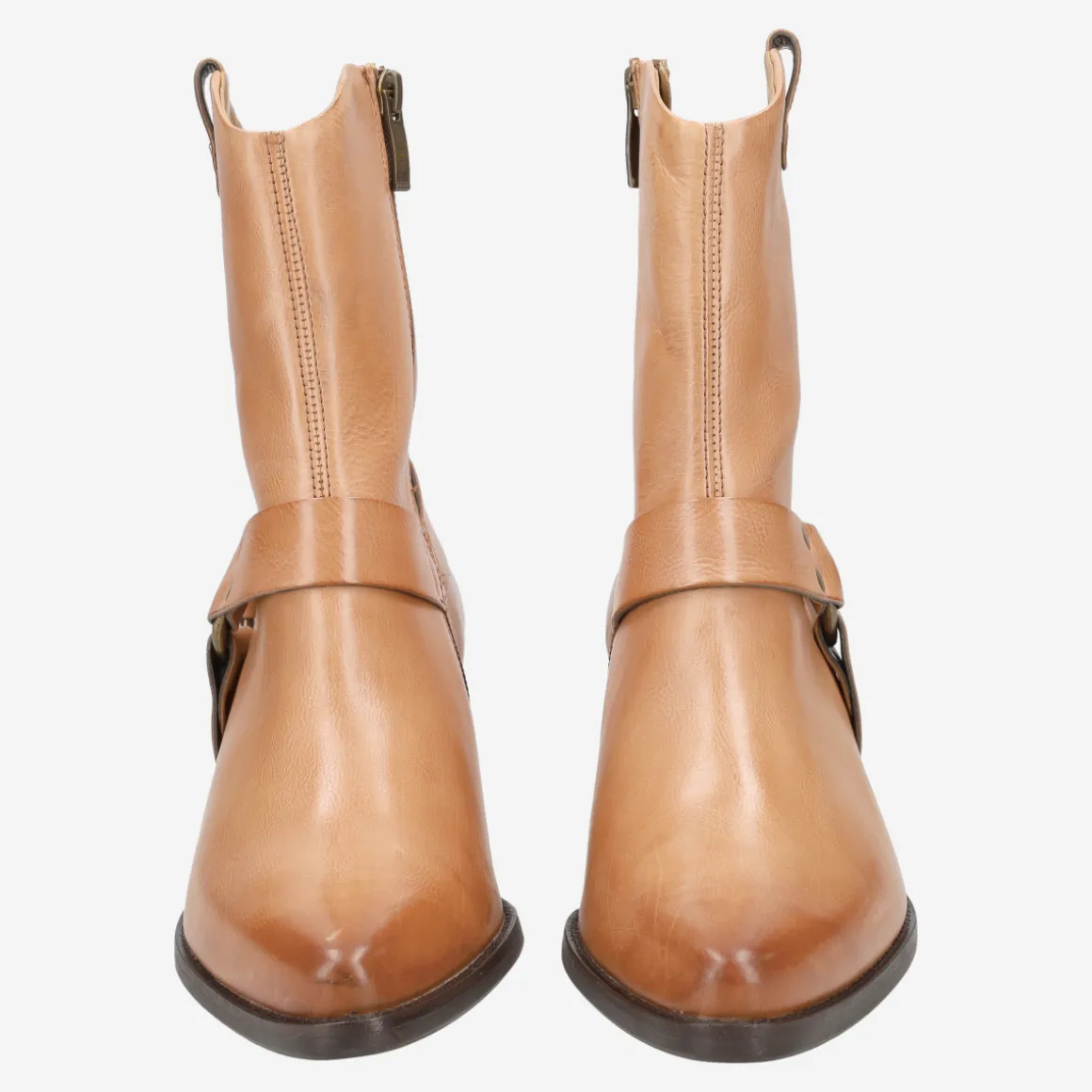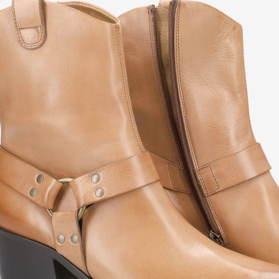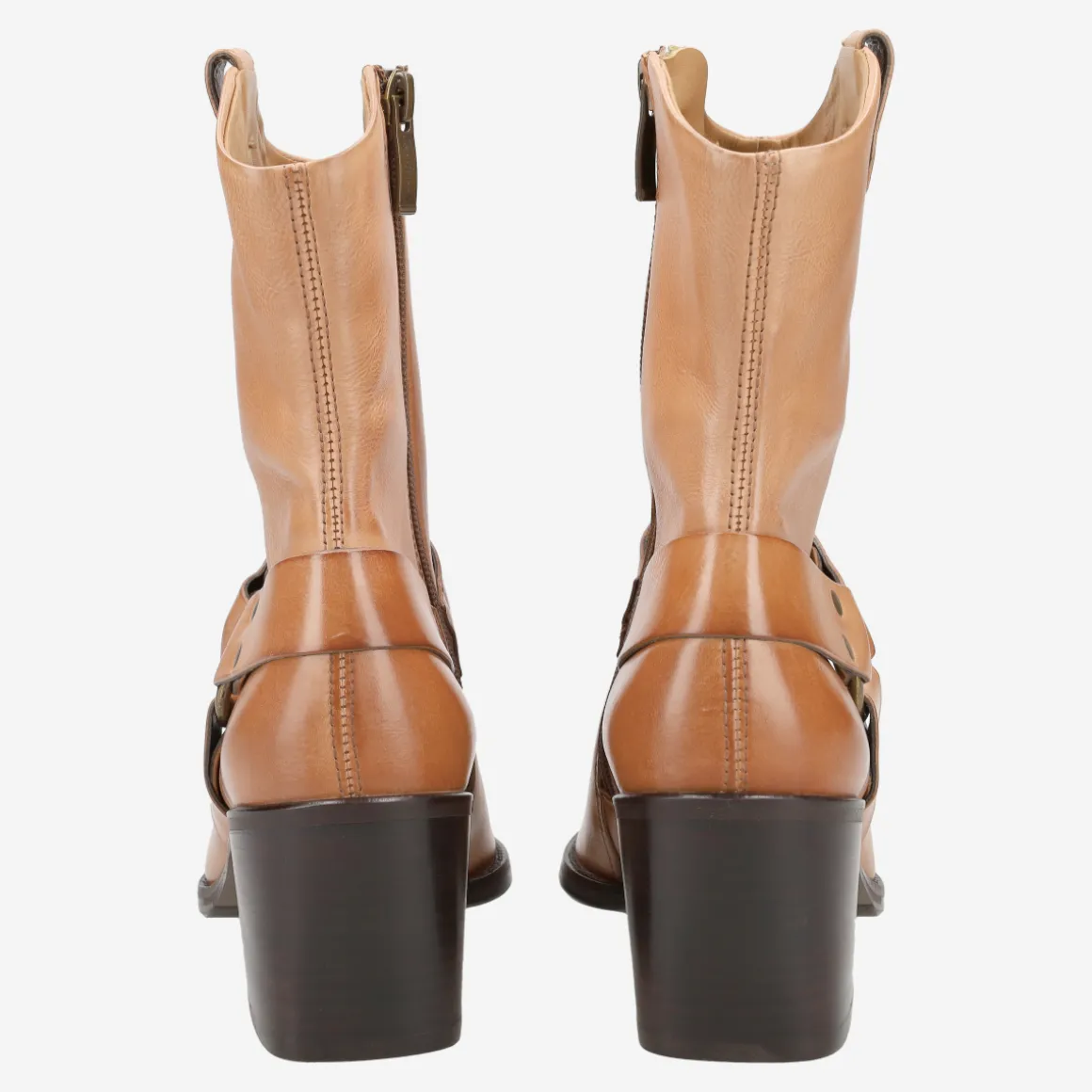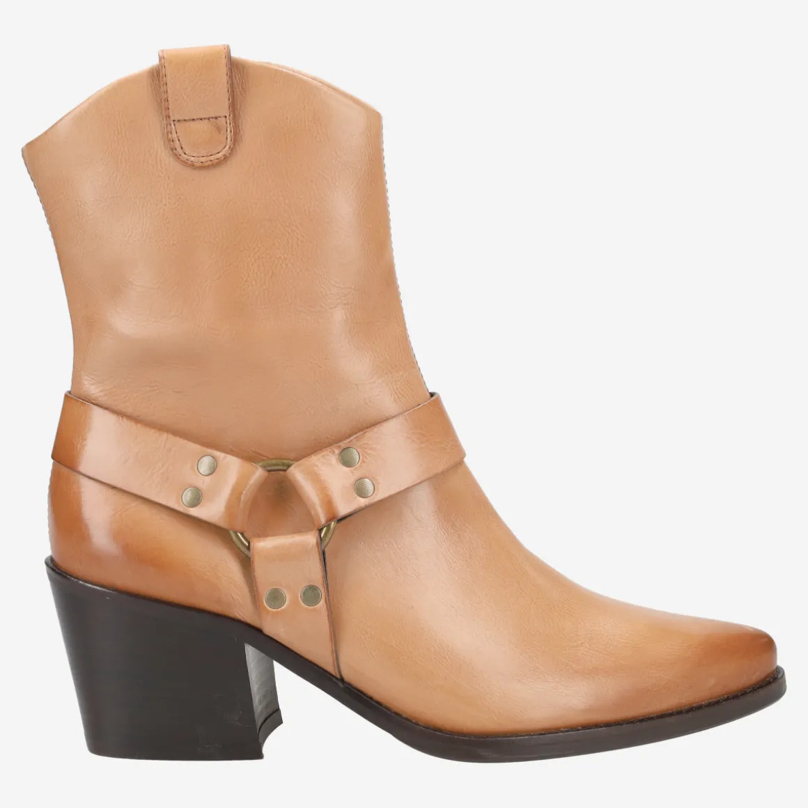 - Block heel, vintage look, decorative stitching, stretch inserts, entry loop, biker-style leather appliqué, decorative metal fastening, western-look design, breathable