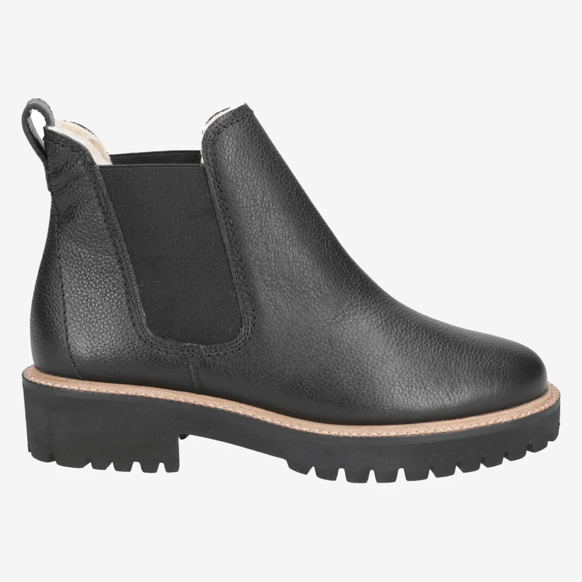 If the word “feel good“ were a shoe, it would definitely be this cozy ankle boot. Paul Green enriches us with a black leather molded, 100% merino wool lined and black EVA sole (light weight) perfection of a shoe. This color combination of the beige contrast stitching and black leather, will have you walking through fall fully on trend. In addition, the laterally inserted stretch inserts provide a comfortable entry and exit. Look forward to fluffy, warm autumn days with your new everyday companion!