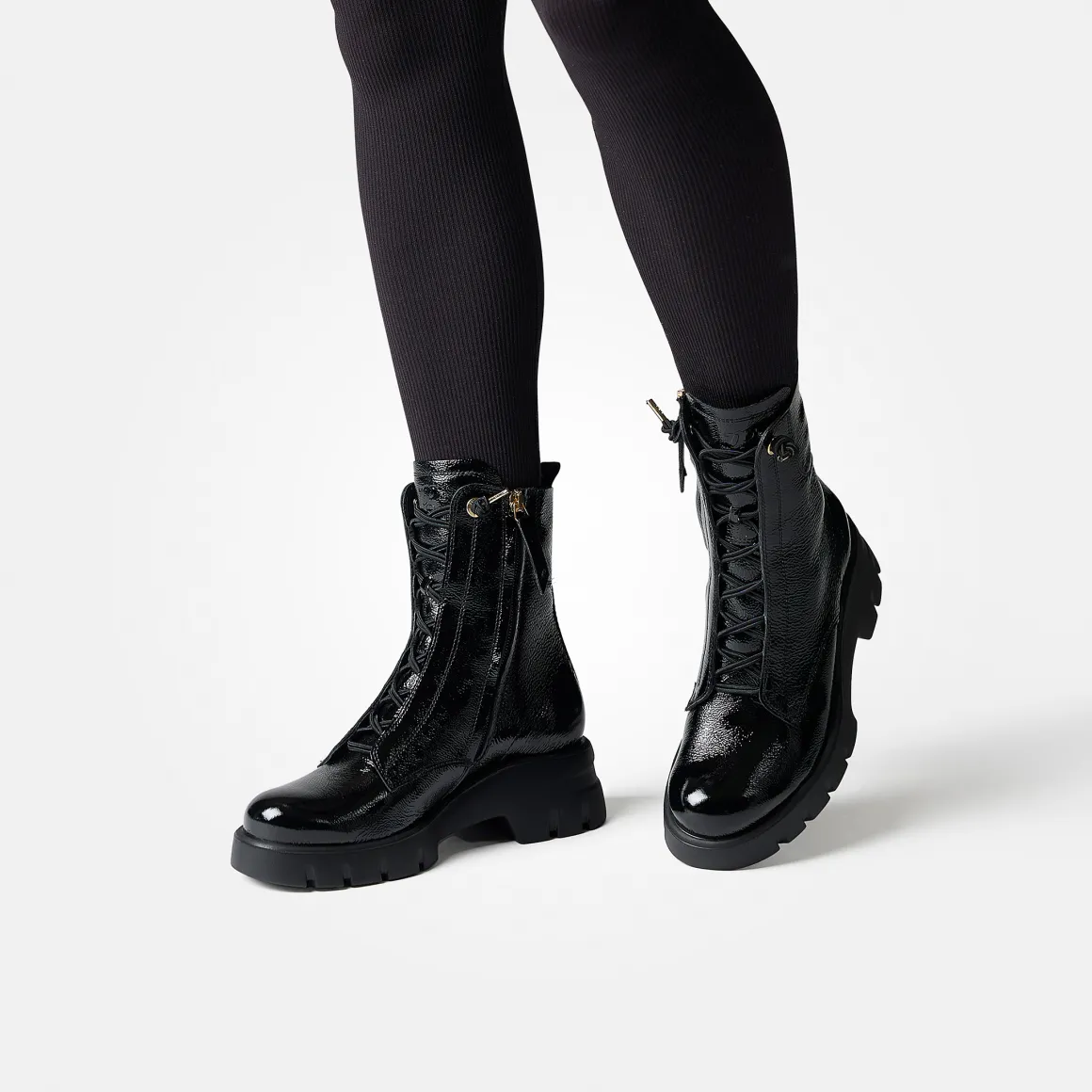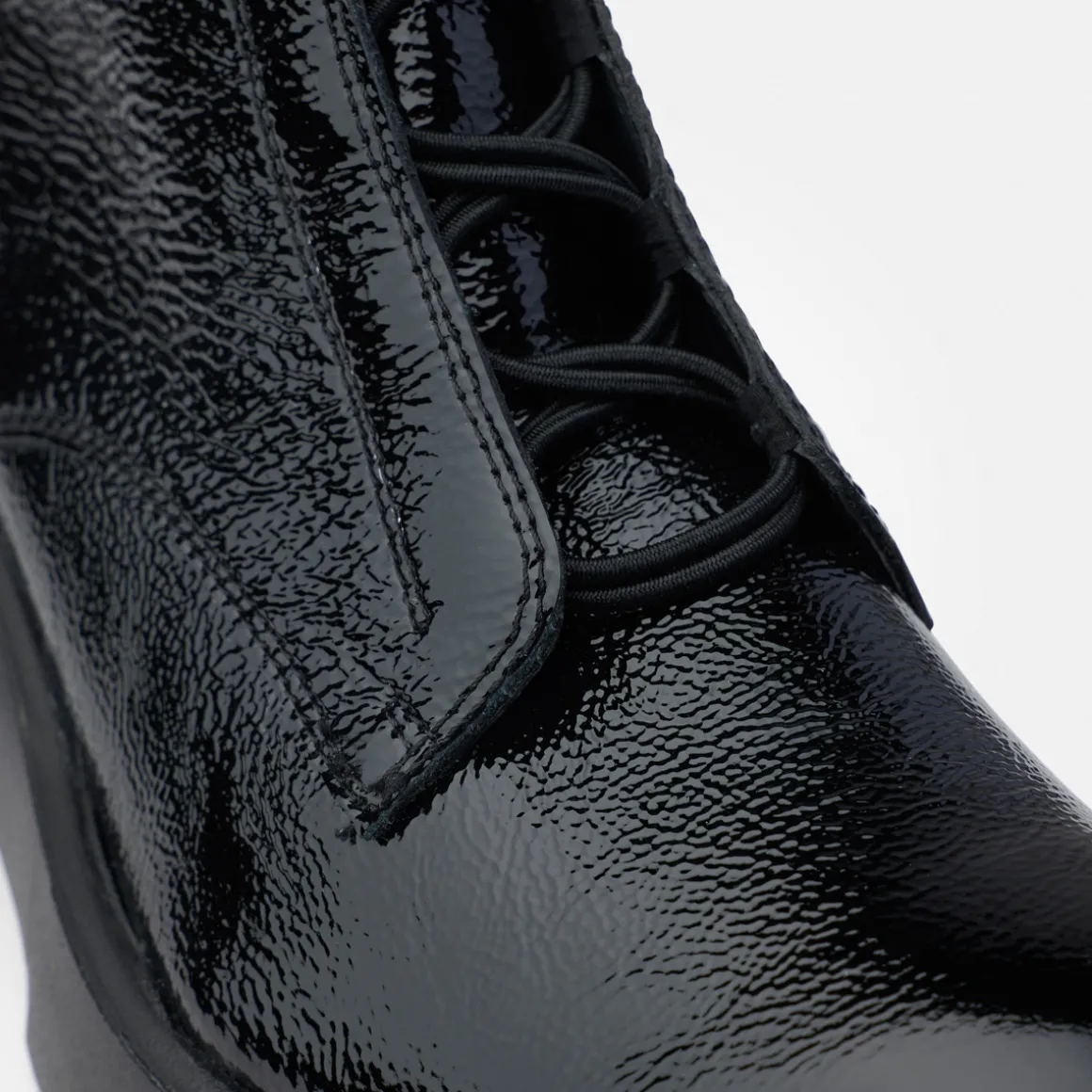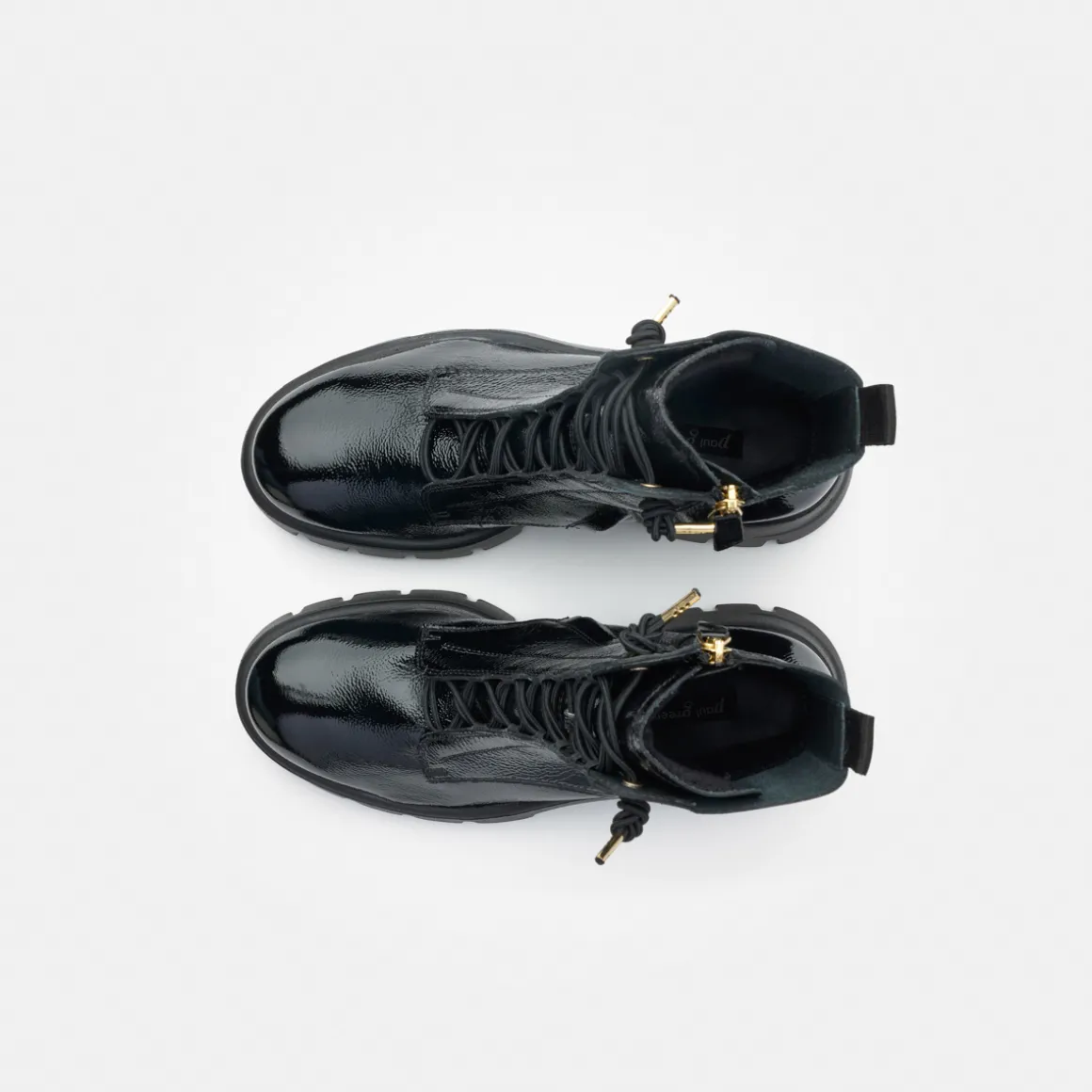 - Made in Europe, PFI Eco-Label LWG – Leather Working Group certified, block heel, platform sole, entry loop, embossed logo, zipper, double elastic lacing and gold-coloured metal details, breathable