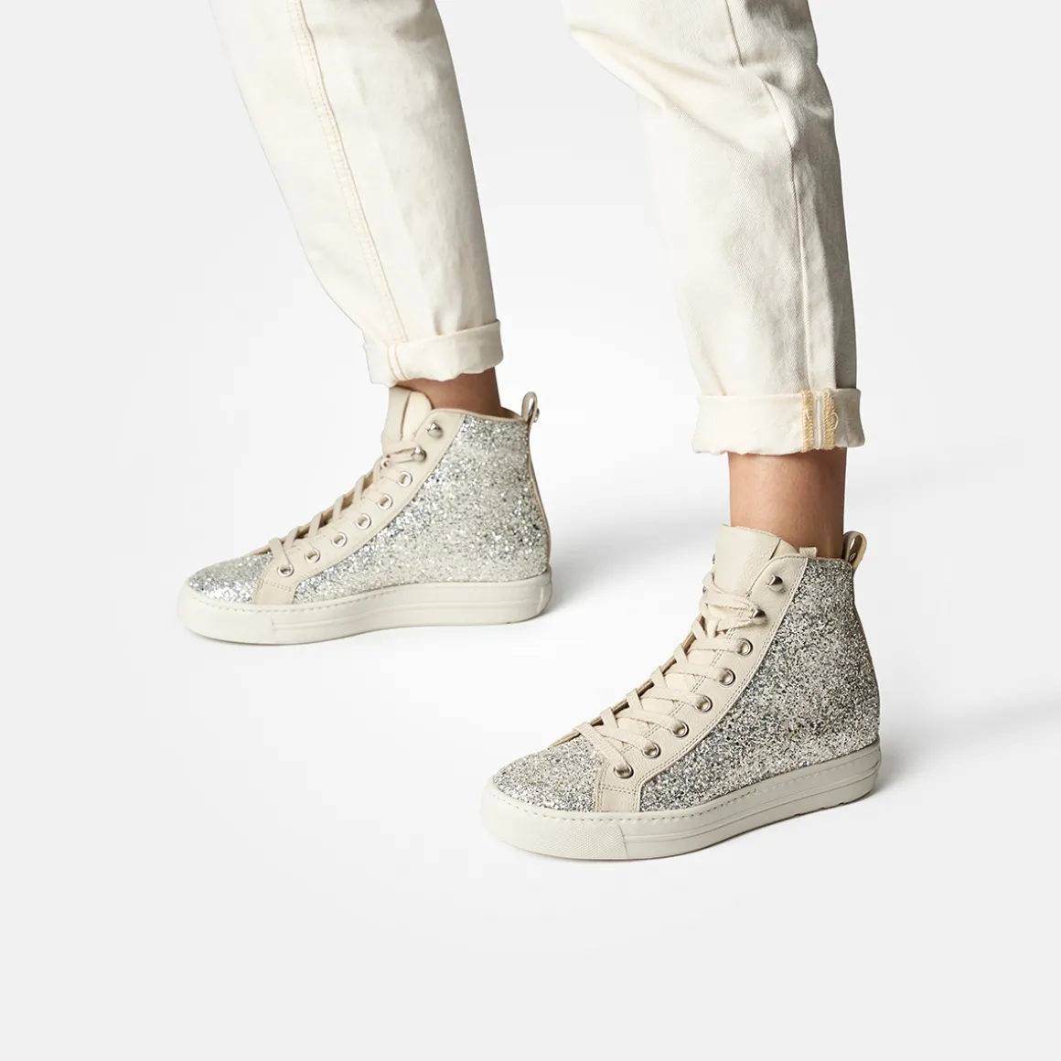 You will love the sporty, sophisticated look of these SUPER SOFT high-top Paul Green trainers. The model impresses with its mix of beige leather and textile fabric with glitter elements. You will feel good with every step thanks to the super soft design with a terrycloth leather lining. The easy-to-wear sole ensures extra comfort. Prove your individuality with these sneakers! Paul Green makes shoes with great passion, which is expressed in perfection, quality, style and fit. The result: a unique, uplifting feel!