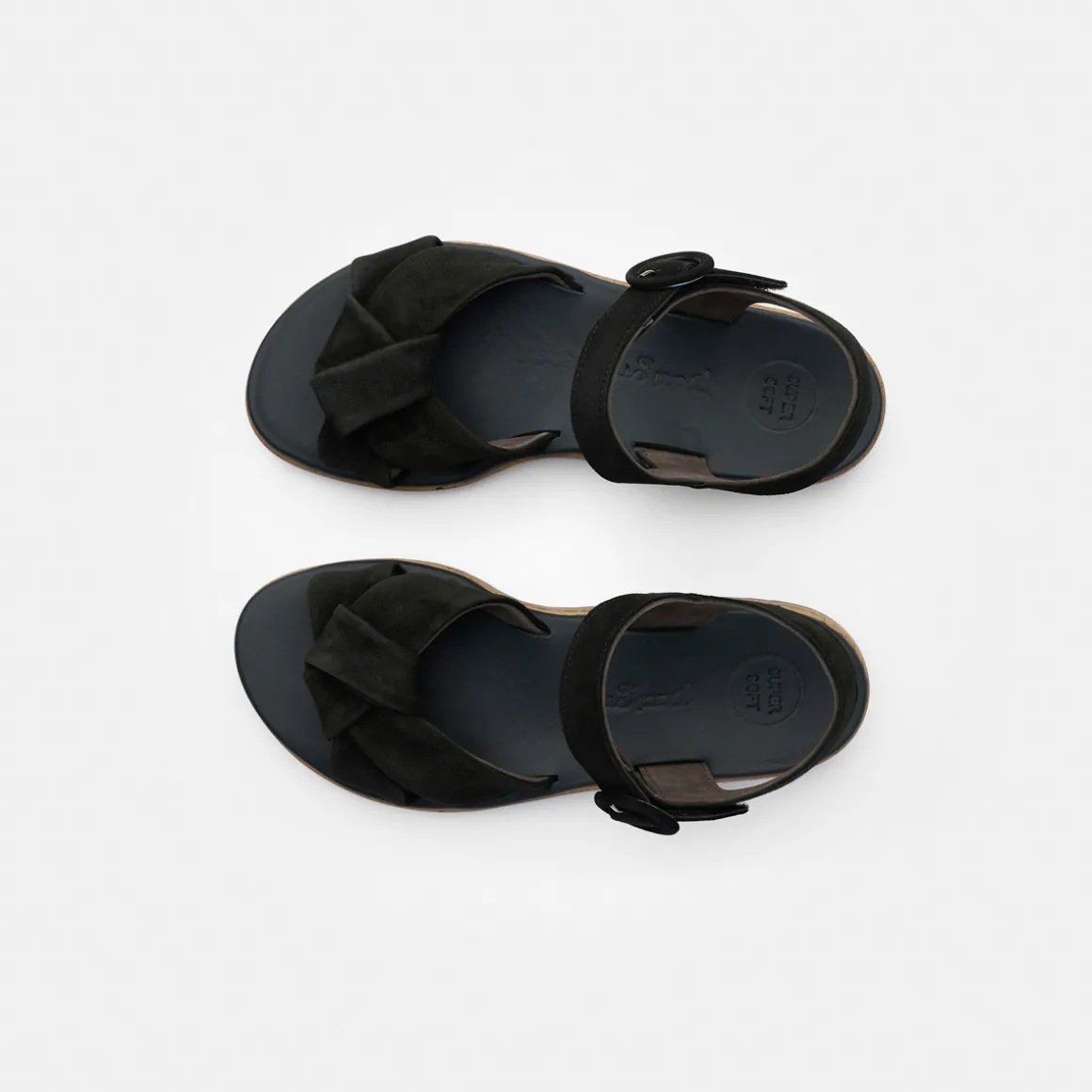 - SuperSoft, supple leather, soft heel cap, light and flexible outsole, soft footbed, breathable / individually adjustable, Velcro fastener, decorative metal fastener, cork-look sole