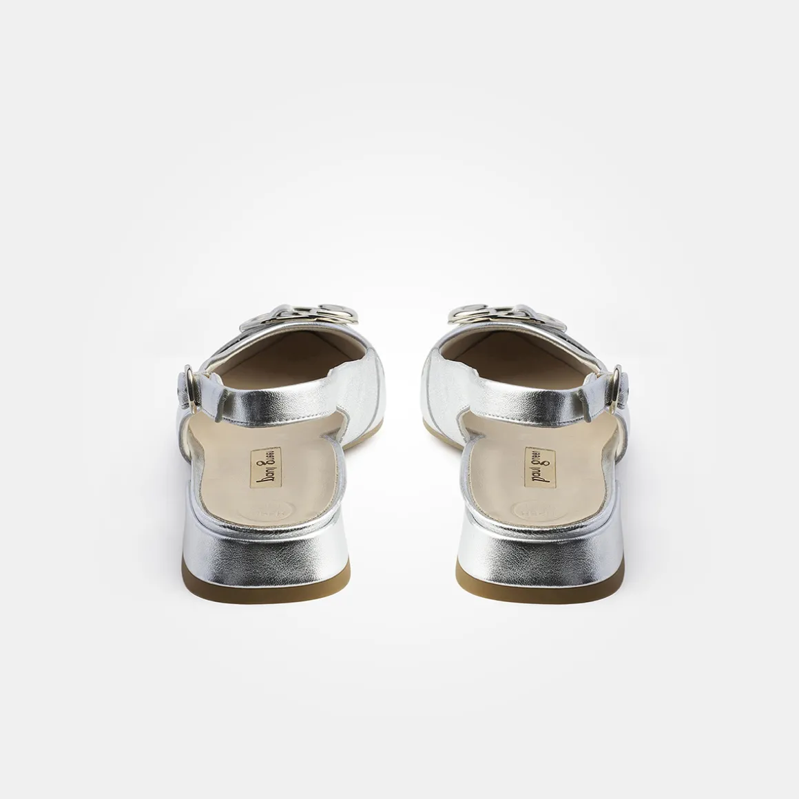 - SuperSoft, supple leather, soft heel cap, lightweight and flexible outsole, soft footbed, stretch insert, decorative buckle in the design of a loafer application, sling pump