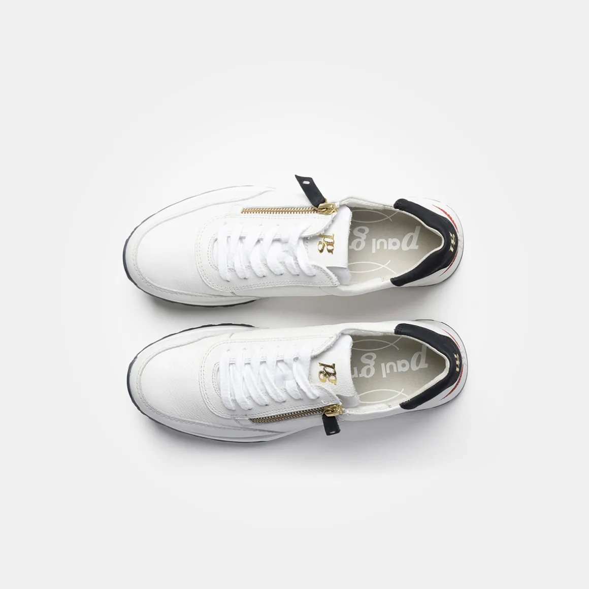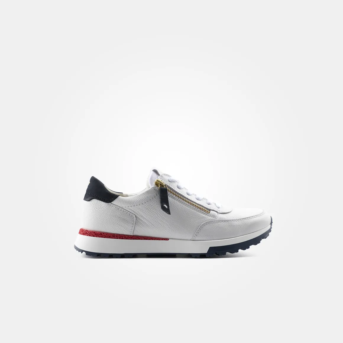 This SUPER SOFT sneaker with changeable footbed from Paul Green is a noble classic with a trendy touch. White smooth and nubuck leather in combination with blue-red color accents gives the style its valuable touch. A classy zipper on the side adds another highlight and optimizes quick on and off. A removable insole can be replaced with your own insoles at any time for added comfort. The runner-friendly sole perfects the wearing comfort of the model. A comfortable pair for all days! Paul Green shoes have a DNA of elegance and sportiness. This DNA is in every single shoe and in the entire range.